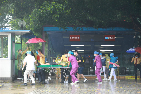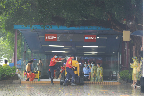 在演練現場,廣州地鐵車站快速響應進行前期應急處置、立即向上級部門報告,同時做好車站內乘客疏導;越秀區啟動應急預案,成立現場指揮部,組織各相關成員單位進駐現場指揮部。各單位組成聯合應急小組第一時間到達現場,迅速開展傷員救治、公交接駁、乘客安置及積水抽排等現場處置。隨後,地鐵工作人員對場地清潔,並進行防疫消殺,完成設備安全評估後,車站各相關出入口恢復通行。