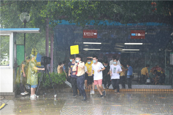 「因電壓波動,列車故障無法動車……」,「站外積水越過出入口進入車站範圍及隧道,現立即關閉車站」。8月8日上午10點,隨着對講機傳來急促的呼叫指令,廣州城市軌道交通運營突發事件應急演練正式啟動。