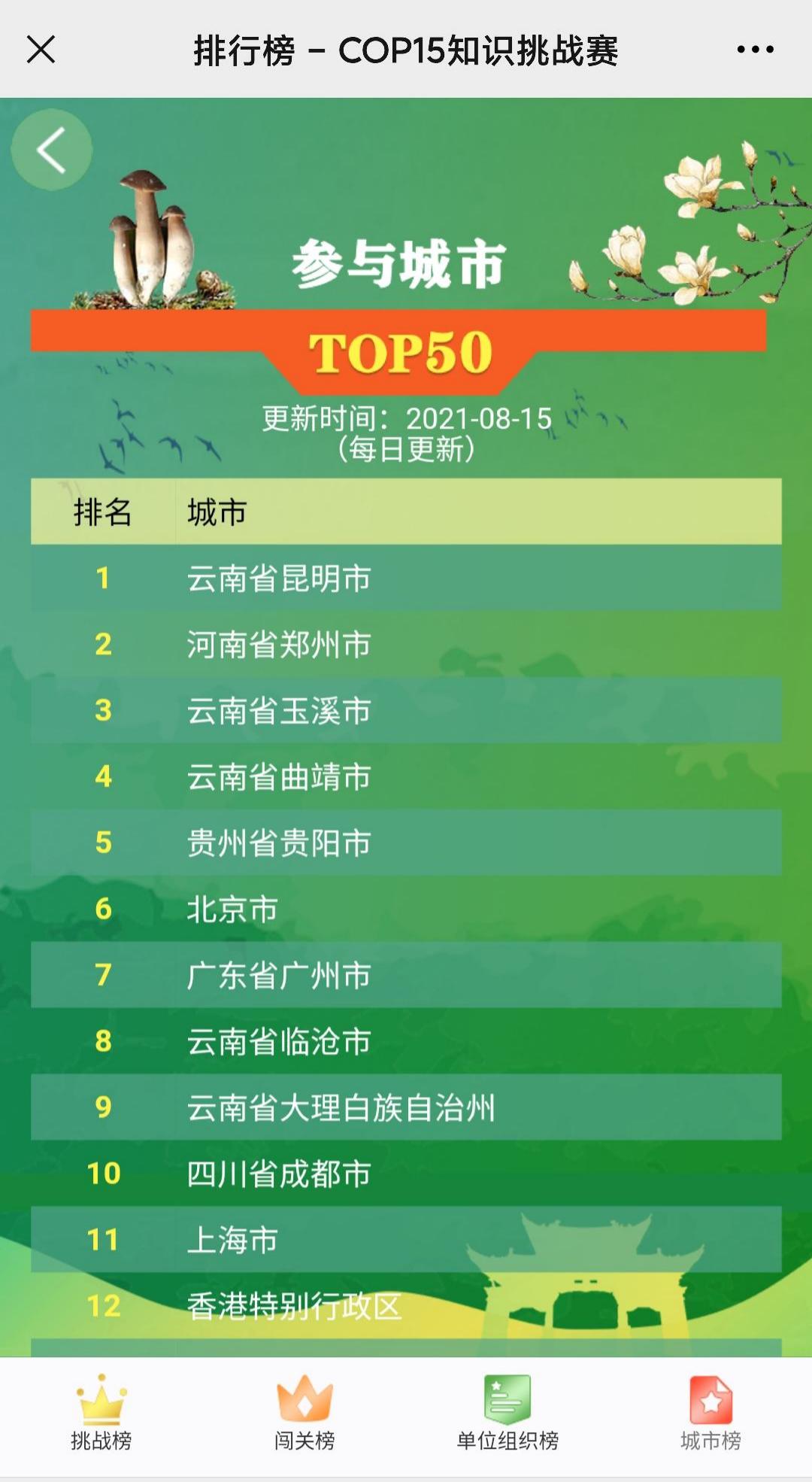 參與此次COP15挑戰賽排名前10位的城市分別為:雲南省昆明市、河南省鄭州市、雲南省玉溪市、雲南省曲靖市、貴州省貴陽市、北京市、廣東省廣州市、雲南省臨滄市、雲南省大理白族自治州、四川省成都市。在本次COP15知識挑戰賽的參與城市中,香港特別行政區排名第12位。