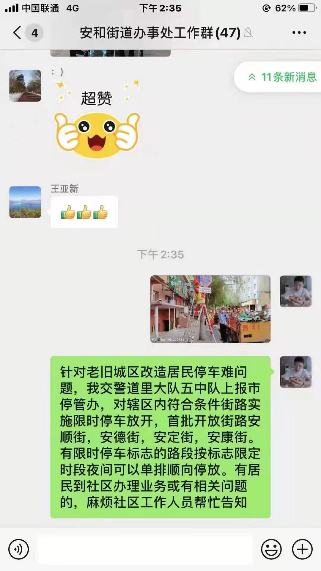 20日10時許,交警道里大隊執勤警力正在更換交通標誌,這一行為引起了附近居民的注意,大家紛紛前來諮詢。據執勤民警介紹,老舊小區封閉改造使「安字片」區域短時間內停車需求增大,轄區大隊實施的允許部分路段行人路、夜間「黃邊石」停車的舉措取得了非常好的效果。在此基礎上,交警部門又深挖停車資源,結合安康街、安順街、安德街、安定街四條街道的道路資源、停車需求、通行效率等條件,在施工期間,取消「24小時禁停」政策,允許附近居民18時至次日7時在「黃邊石」旁單排順向停放。「這個政策太好了,不僅解了我們的燃眉之急,而且交通標誌明了、清晰,以後停車也就更放心了」,市民李先生高興的說到。