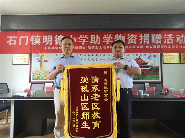 洛南縣副縣長李大為(右)向香港陝西商會贈錦旗