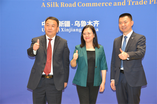 中國國際貿易促進委員會兵團分會副會長柯重任(左)、新疆生產建設兵團商務局副局長孫浣濤(中)、新疆商務廳黨組成員、副廳長張碩(右)在新疆兵團經貿發展產業合作推介會合影留念