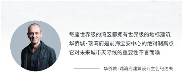 華僑城·瑞灣府彙集百年奢華瑞吉酒店、企業會館、精緻商業於一處,以45°旋轉造型、2.4米超寬幅幕牆設計,呈現絕佳紀達夫、傅厚民、關永權、鄭忠、Andrew Corner世界級大師連袂設計,匠心雕琢每一處細節,以藝術空間致敬城市塔尖圈層。