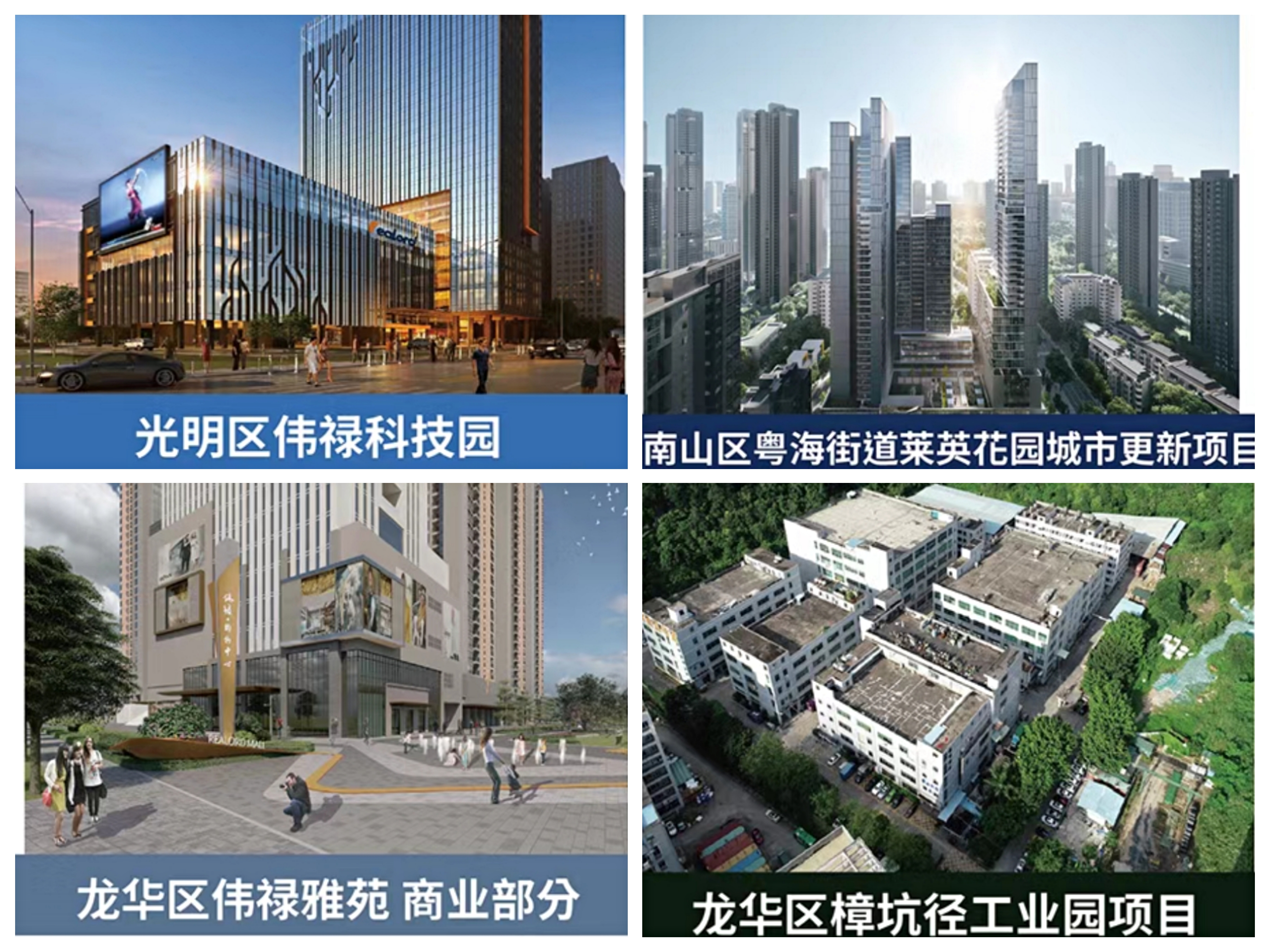 偉祿集團旗下物業包括三項城市更新項目——「工改商住」的茜坑物業、樟坑徑物業,和位於南山「最牛街道」的萊英花園舊改;以及兩項較為成熟的項目——龍華區偉祿雅苑綜合項目和光明區偉祿科技園。