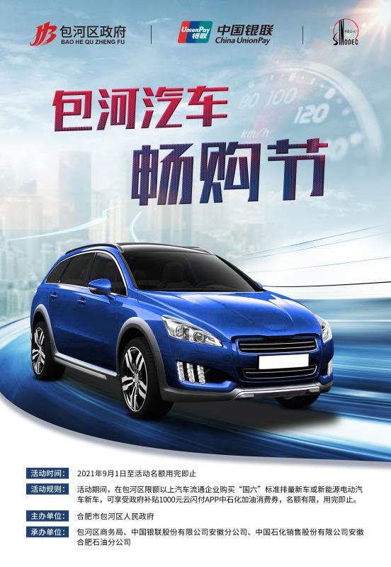 記者此間從安徽省合肥市包河區商務局獲悉,本次活動期間,凡在包河區限額以上汽車流通企業購買「國六」標準排量新車或新能源電動汽車的,補貼購車人1000元中石化加油券,活動名額用完為止。待資料審核結束後,由中國銀聯股份有限公司安徽分公司通過雲閃付APP為補貼對象配置發放專用紅包。