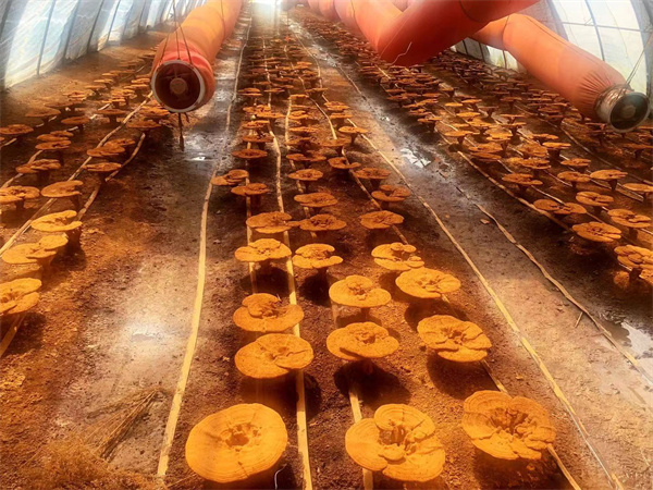 「不可思議」,「眼界大開」。暗棕色似花傘般的菌蓋「池塘」,上面「住」滿了棕褐色孢子粉,「傘蓋」下住着「神氣十足」的無數小林蛙……8月30日,記者跟隨黑龍江省農業農村廳中藥材發展處處長修國輝一行來到大慶市肇州縣雙發鄉現代中醫農業重要結合特醫食品生產基地,走進靈芝和林蛙種養示範大棚,記者便被一株株長勢喜人的靈芝和一隻只活蹦亂跳、皮膚光滑的林蛙深深吸引、不由嘖嘖讚嘆。懸掛在大棚內似紅色長龍般的風機呼呼作響,它們正在採收漂浮在空中、肉眼根本無法看見的孢子粉。目前,正值采粉期,據初步估算,一棟大棚三天時間,約可吸出來4-5斤孢子粉,效益十分可觀,已是全省獨角獸產業,成為拉動全省大健康產業發展的一支勁旅。