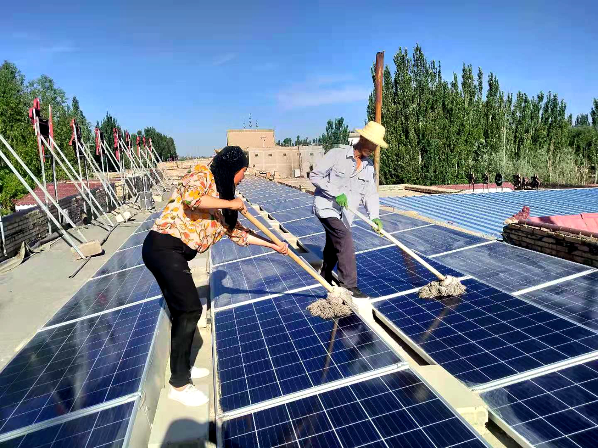 秋日的午後,在甘肅省瓜州縣雙塔鎮新華村黨群服務中心屋頂上,一排排整齊閃亮的光伏電板在藍天白雲的映襯下,享受着「日光浴」。公益性崗位人員孔令得和往常一樣,前來查看、維護設備光伏電板。