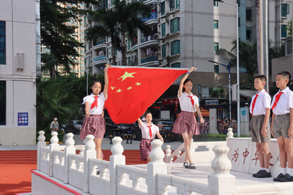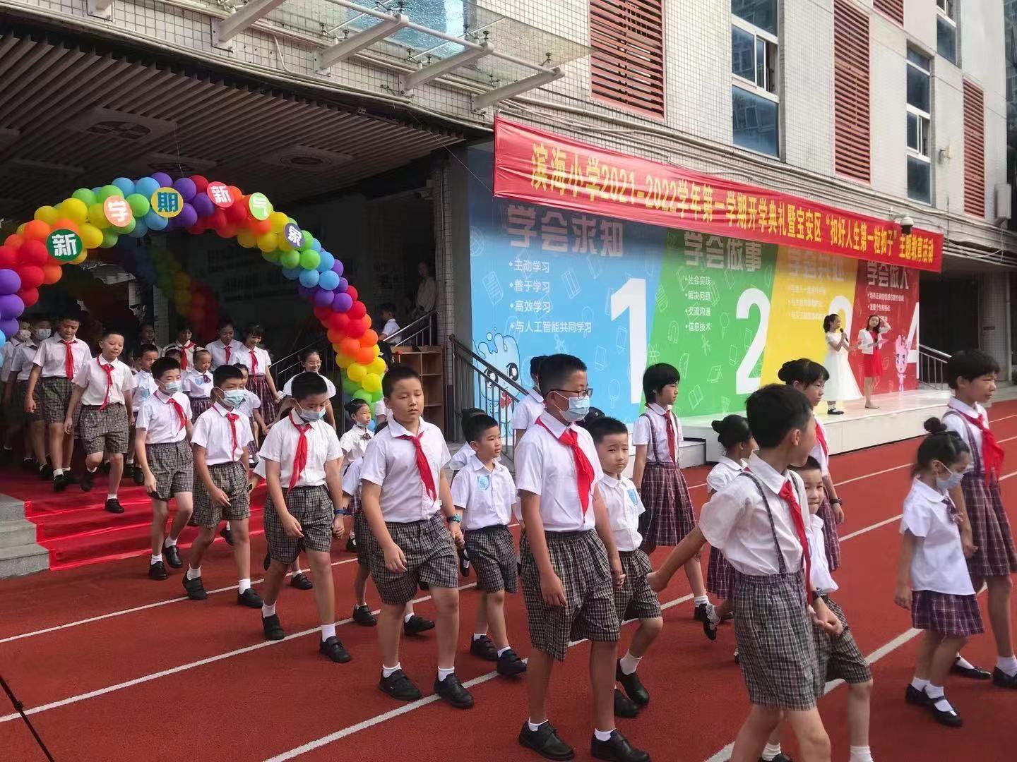 六年級的學生牽手引領小一新生入場,大手牽着小手,畫面溫馨。隨後,現場進行了升旗儀式,學生們面向國旗敬禮。小學階段是為幸福人生奠基的階段,習慣的養成、價值觀的形成將會影響人的一生。濱海小學校長李桃輝在開學典禮上勉勵學生:「正確價值觀的形成,就像穿衣服扣扣子,如果第一粒扣子扣錯了,剩餘的扣子都會扣錯,所以人生的扣子從一開始就要扣好。」隨後,小一新生收到了一張封面印有「夢想啟航」的賀卡。賀卡的設計是門的形狀,寓意小朋友踏上求學之路,童蒙啟正,啟智潤心。