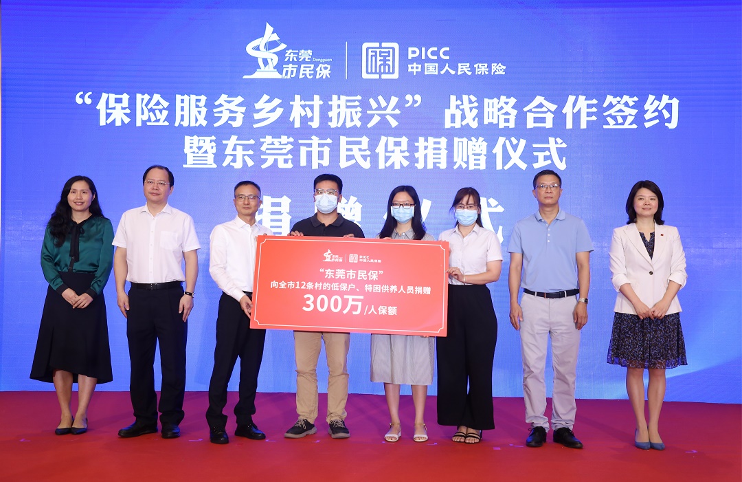 2日,「保險服務鄉村振興」戰略合作簽約暨東莞市民保捐贈儀式廣東省東莞會展酒店舉行。儀式現場,東莞市農業農村局與中國人民財產保險股份有限公司東莞市分公司簽訂戰略合作,並舉行「東莞市民保」捐贈儀式,為東莞12個村的低保戶、特困供養人員暖心捐贈每人300萬保額的保障,發揮惠民醫療補充保險在助力鄉村振興,防止農村困難家庭因病致貧的多元保障作用。