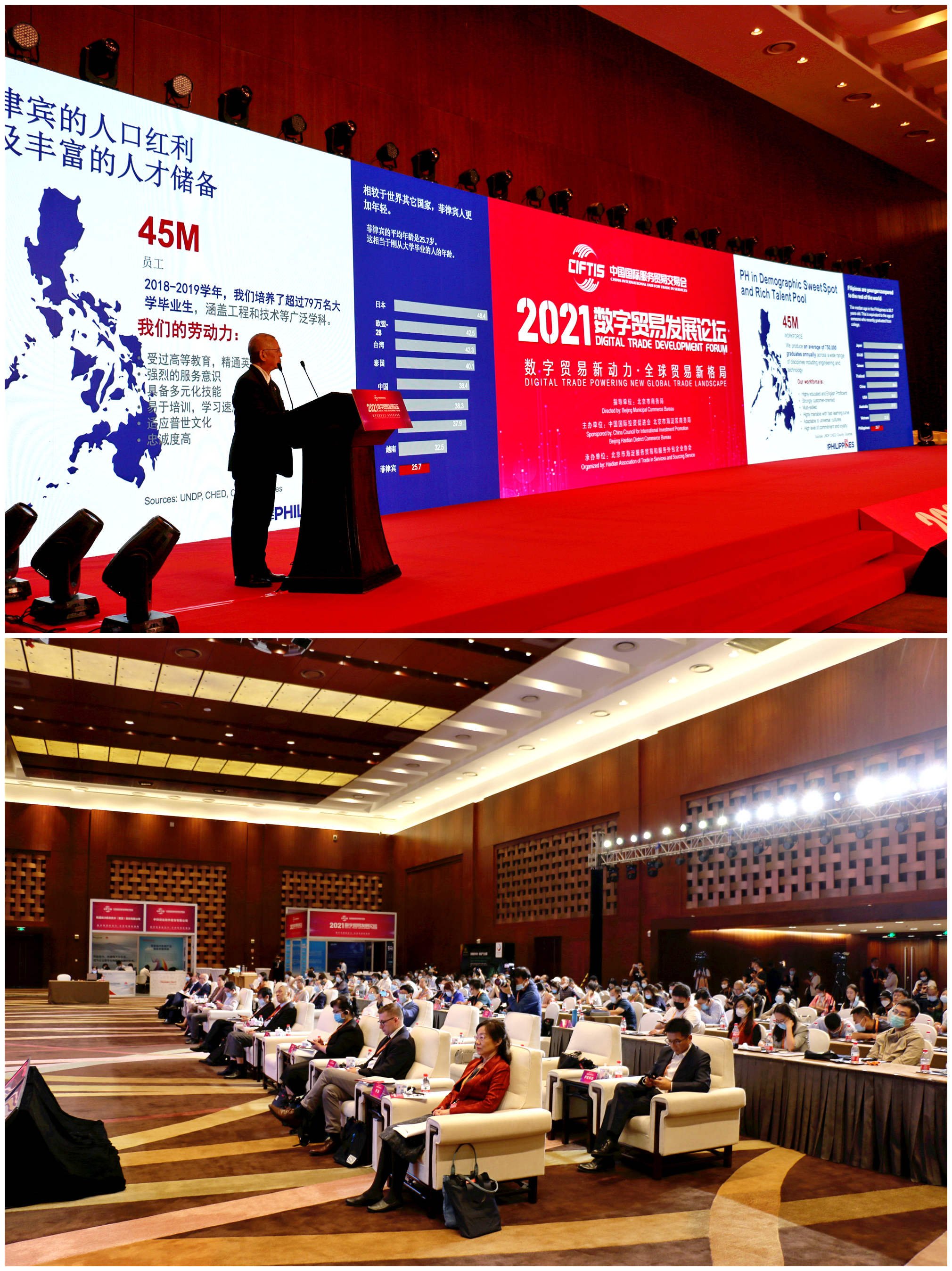 中國國際投資促進會的常務副會長劉作章、菲律賓共和國駐華大使何塞·聖地亞哥·羅馬納先生、北京市商務局二級巡視員劉軍、北京市海淀區副區長林劍華出席並做了精彩致辭。多位重量級嘉賓,知名數字貿易企業以及房地產、園區企業領導亮相大會,智慧交鋒、觀點碰撞。
