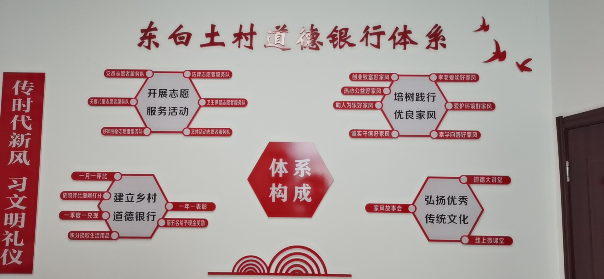 白山鎮積極探索新型農村社會治理體系,推廣以「道德可積分、文明又加分、滿意度得分」為主的家庭道德積分獎勵機制,在每個村建立「道德銀行」,但不存金錢,而是存儲一份美好的品德,村民通過在遵紀守法行為文明、熱心公益支持發展、誠實守信勤勞致富、家庭和睦鄰里團結、治安管理及加分項6大項20小項的表現情況獲得道德積分,存進「道德銀行」,最終兌換相應的精神榮譽和生活物品。目前,「道德銀行」已經成為白山鎮新的文明行為準則,實現了村民「被動管理」到「主動管理」的轉變,為鄉村振興注入新動能。