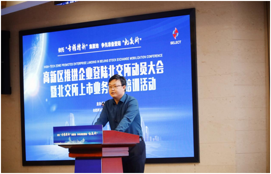 9月8日,安徽省合肥高新區推動企業登陸北交所動員大會暨北交所上市業務專題培訓大會在高新區管委會舉辦,共有120家企業和證券機構代表近200人參會。當天,安徽證監局會計監管處處長戴見,合肥高新區黨工委委員、管委會副主任劉登銀出席活動並致詞。新三板創新層企業創新美蘭董事長分享經驗,華泰聯合證券資深專家做主題培訓。