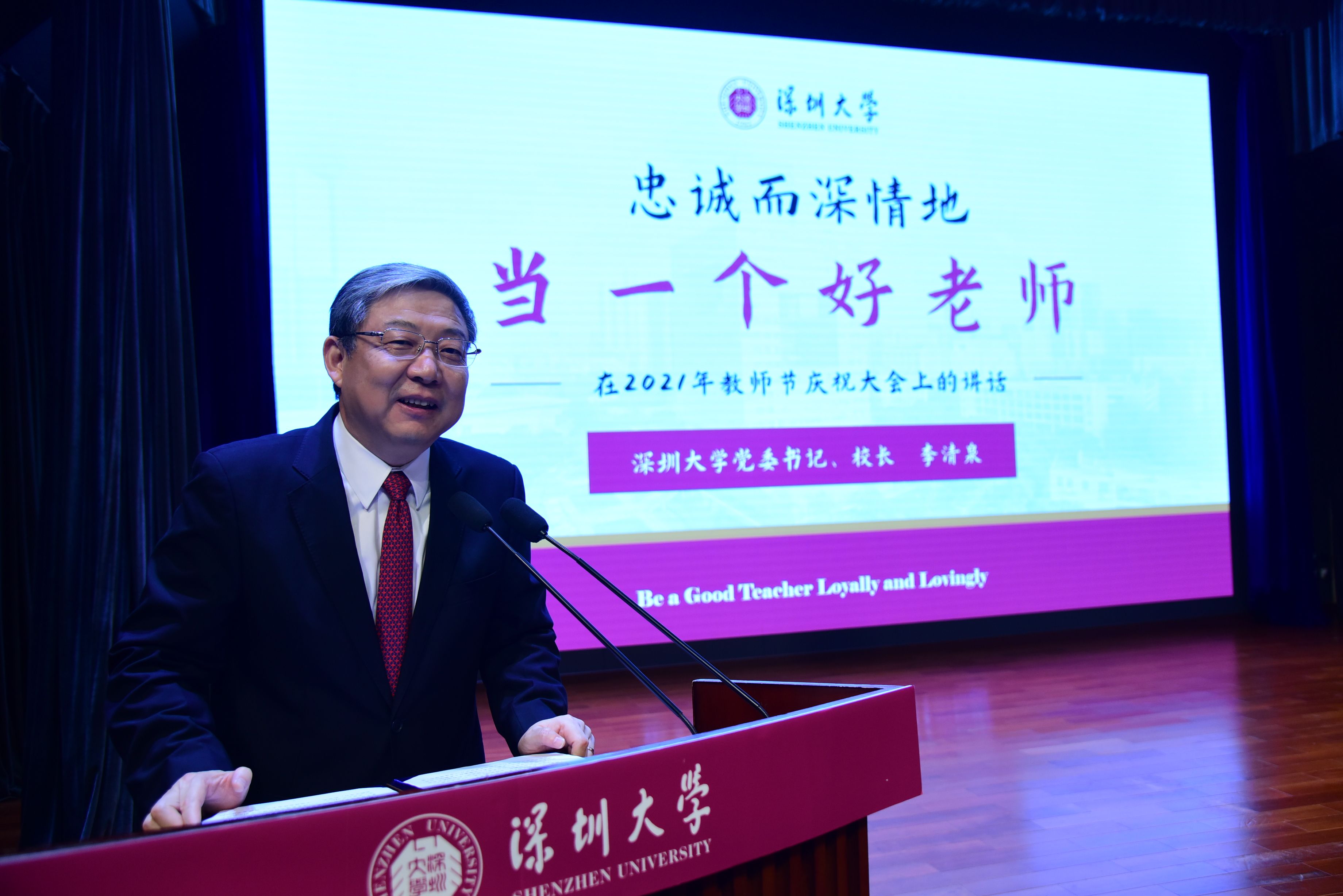 李清泉還談到深大精神與夢想。他說,最核心的深大精神,即深大的「三自」校訓——自立、自律、自強。為中國特色社會主義事業造就自立、自律、自強的一代新人,就是深大老師們對深大精神最忠誠、最深情的詮釋。而深大追逐的夢想,便是努力成為「好老師」的夢想,是成為自覺將生命意義建構於傳承和照亮之上的知識人,因為「唯有忠誠而深情的好老師可以衝破人生終結的重圍」,做到師者永存,師道永昌。他勉勵每一位深大教師:珍惜人生賜予的每一個朝夕,忠誠而深情地當一個好老師!