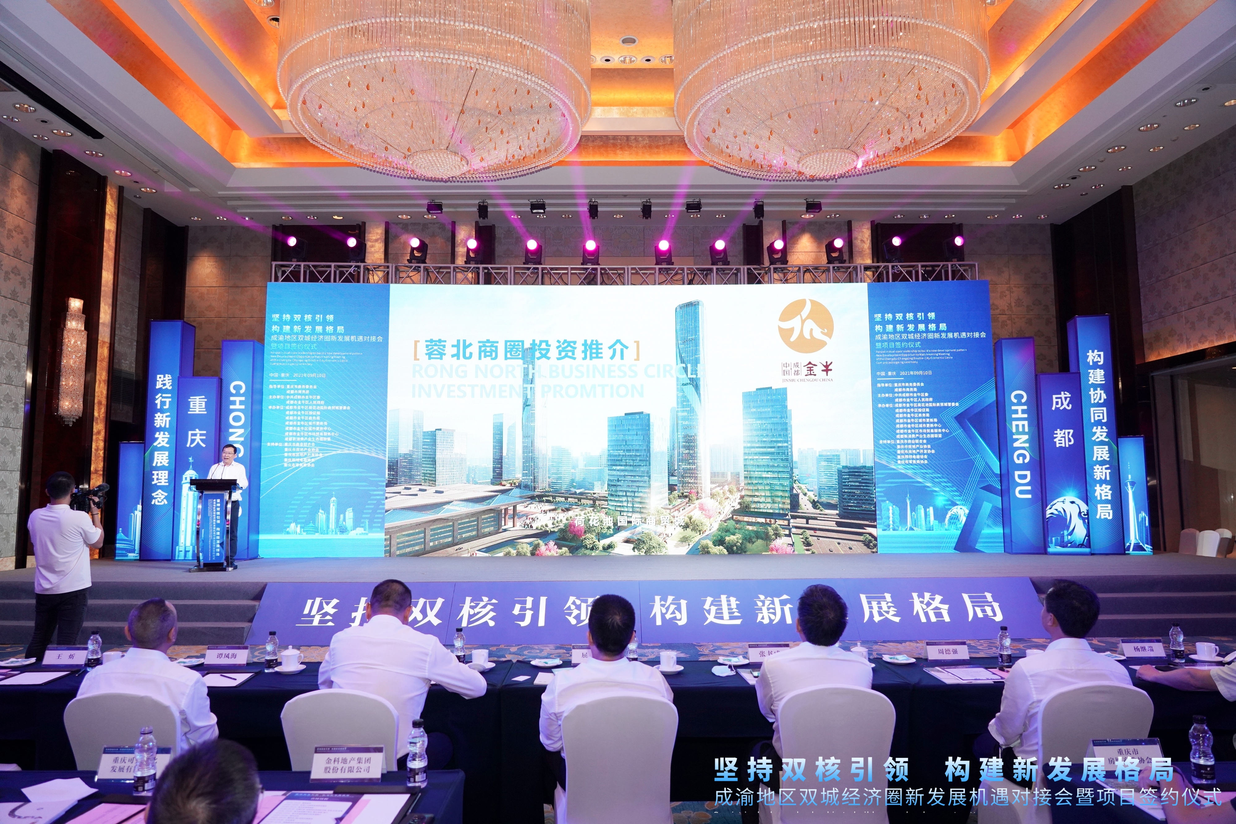 9月10日,以「堅持雙核引領構建新發展格局」為主題的成渝地區雙城經濟圈新發展機遇對接會暨項目簽約儀式在重慶舉行。是次活動由重慶市商務委員會、成都市商務局指導,成都市金牛區委、成都市金牛區人民政府主辦,金牛區荷花池國際商貿城管委會、金牛區投促局、金牛區商務局、金牛區城市更新局、金牛區城市更新中心、金牛區市場貿易服務中心、成都新消費產業生態圈聯盟承辦。