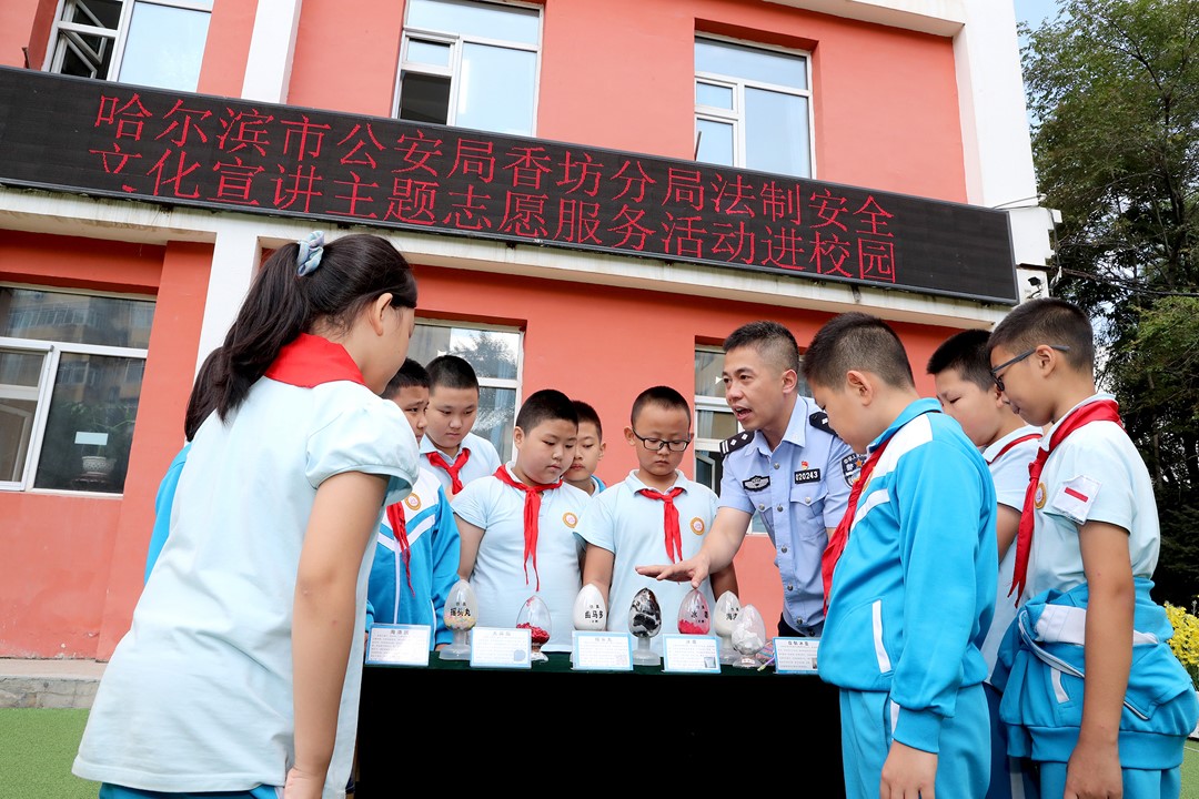 據悉,活動啟動日當天,道里、道外、南崗、香坊等九區公安機關的法制宣講員、轄區小學校法制副校長,分別來到轄區小學校,開展法制安全文化主題宣講活動,為近千名小學生上了開學季「法制安全第一課」。民警們從法律的定義和種類講起,利用PPT 展示,深入淺出、形象生動地講解了預防交通事故、毒品侵害、校園暴力等方面的安全防範常識。同時,現場的毒品、假幣、假藥等實物展示,讓同學們更加直觀地認清了上述違法行為的危害。