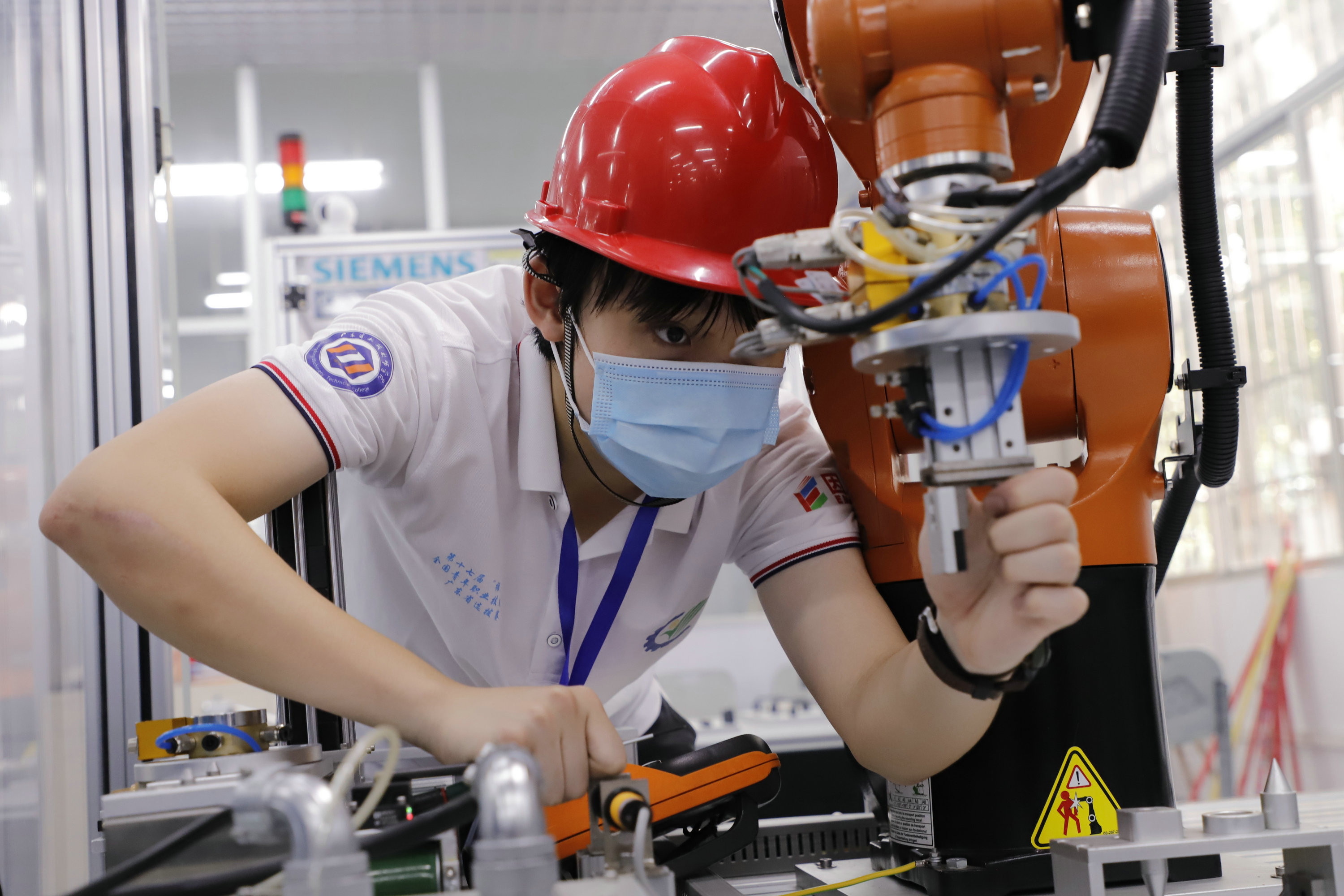 現場,裁判一聲令下,楊同學馬上打開設備,熟練地操作起來。與此同時,「工業機械人系統操作員」競賽的其他20多名選手同樣全神貫注,按照試題要求逐步設計動作。事實上,這一刻楊同學期待了多年。