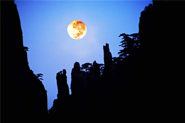 秋天的黃山,漫山紅遍、層林盡染。當夜幕降臨,皎潔明月從山峰間冉冉升起,高懸在黃山夜空,月亮四周伴有祥雲襯托,顯得格外迷人。黃山因空氣純淨清新,有很好的能見度,且海拔高,視野開闊,月亮比在山下看上去顯得更大更圓。