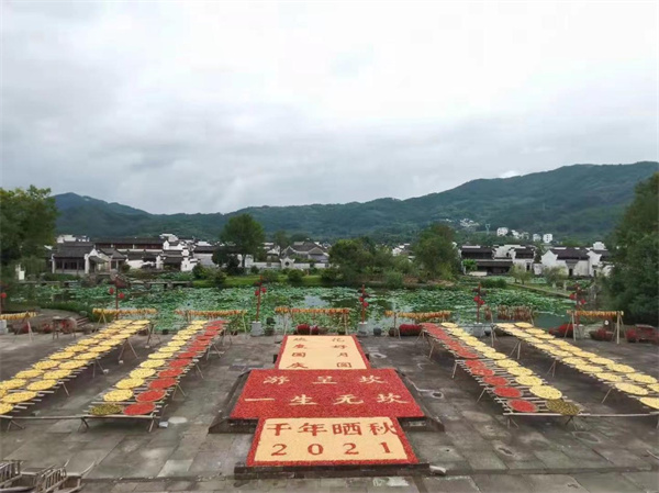 第四個中國農民豐收節前夕,在皖南千年古村呈坎村的晾曬場上,村民將收穫歸倉的玉米、黃豆、稻穀南瓜和紅辣椒等果實拼出「花好月圓、歡度國慶」字樣,以農家特有方式向表達對鄉村振興美好生活的嚮往。