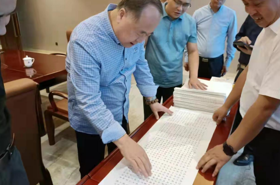 白建新把莫言的長篇小說《蛙》硬筆書法長卷呈給莫言並激動地說:「我是一名基層公安民警,是您的忠實粉絲,今天終於見到您了!」莫言接過作品,看的很認真、很仔細……作品筆畫剛勁有力、鐵畫銀鈎。字體流暢舒展、氣息自然、骨感很強、重心平穩、大方美觀。感慨地說:「寫得真好,能出書法字帖了。」近日,莫言在武威講學考察期間,長篇小說《蛙》成就了小說作者和書法作者的美麗相遇,莫言文學社將對該作品永久收藏。