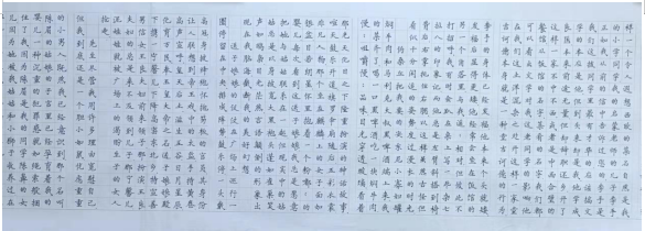 白建新是武威市民勤縣一名基層民警,從警近30年,把一身正氣和滿腔熱情融於硬筆書法之中,形成了自己獨特的書寫風格,創作硬筆書法作品300多幅。去年初,白建新突發奇想、萌生衝動,想要將莫言的長篇小說《蛙》用硬筆書法在宣紙上創作出書法長卷。26萬字的篇幅,是一個巨大的工程,600多個日夜的堅持和心血,現已完成20多萬字。硬筆書法耗時費力,在宣紙上書寫更是難上加難。白建新憑着自己的堅強和韌勁,硬是在硬筆書法創作中練出了自己的風格和特色。尤其在宣紙上創作長篇作品,硬筆書法界尚屬少見。