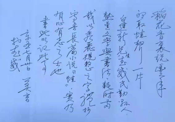 莫言勉勵白建新再接再厲,繼續努力。並為硬筆書法作品《蛙》題寫寄語:稻花香里說豐年,聽取蛙聲一片,白建新先生武威民勤縣人,熱愛文學與書法,耗時兩載以秀麗規整之字體抄寫吾長篇小說《蛙》,實乃有心有志之士也。