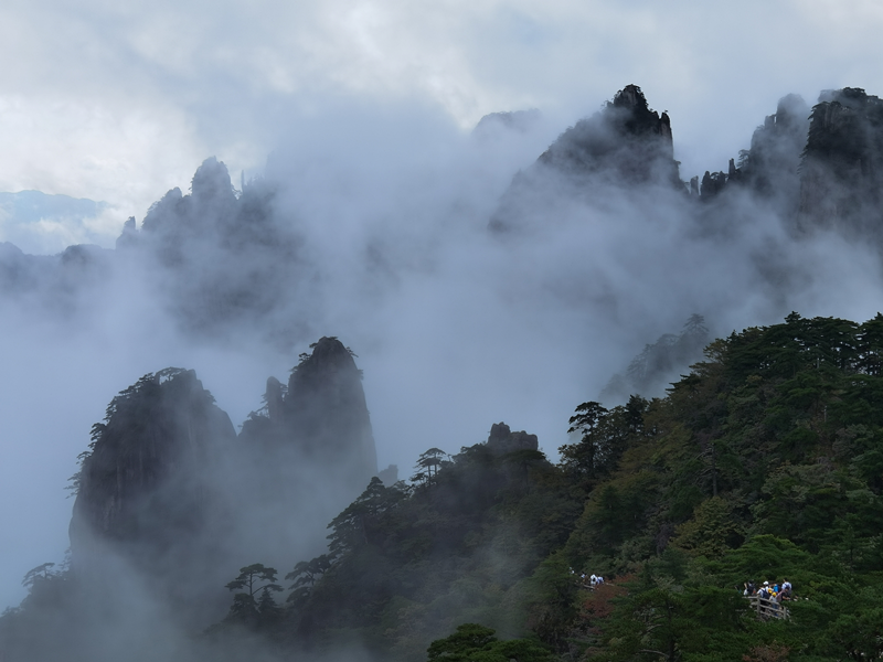 遠峰近松,在雨水的清潤下,更顯清新,雲霧在山間飄渺,令人心曠神怡。在玉屏景區、北海景區等處,遊客駐足流連,觀賞著醉人的黃山秋色。漫步山巔,奇險峻秀的山峰與氣韻通透的秋景相融相濟,讓遊人不禁怦然心動,紛紛用手中的相機和手機拍攝下難忘的情景。