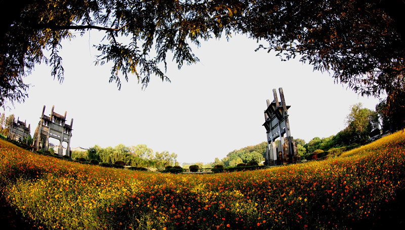 9月24日,安徽歙縣棠樾村牌坊群邊上的“格桑花”盛開,金色黃花為山村秋景增色。