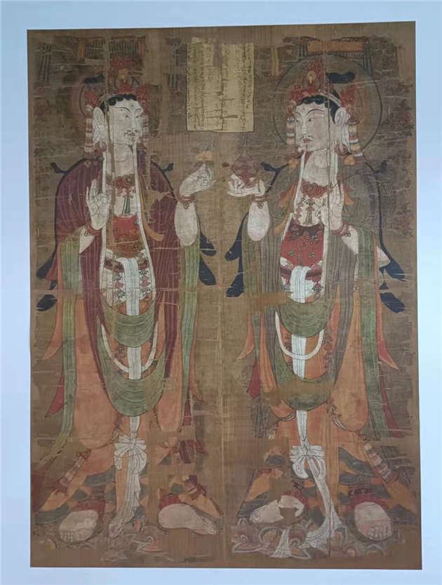 《將軍論》殘卷、水月觀音像、二觀世音菩薩像、四觀世音文殊普賢菩薩……敦煌流散海外文物複製展展館裡,英國大不列顛博物館、英國國家圖書館、法國吉美博物館、美國紐約大都會博物館等國外收藏機構收藏的敦煌藏經洞文物複製品成列展出。