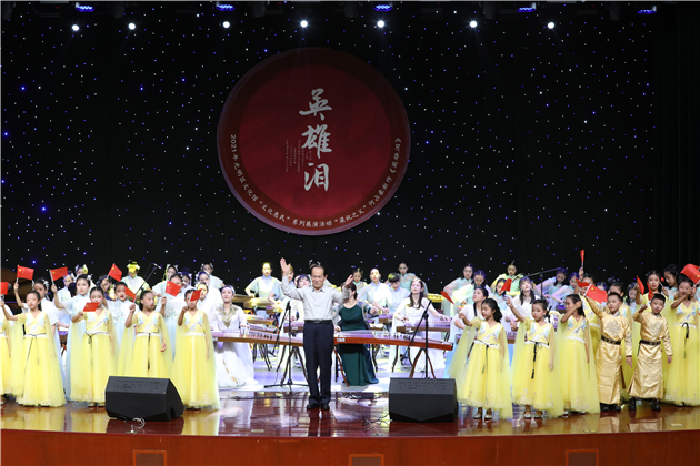 本場惠民展演以古箏協奏曲《英雄淚》為主線演出作品,將何占豪的經典作品融匯成愛黨愛國的音樂禮讚,弘揚中華民族波瀾壯闊的英雄史詩。用音樂篇章呈現一眾民族英雄的內心世界及其身後不可磨滅的民族精神,該曲將古箏對細膩情感和恢弘氣勢的演繹發揮到極致,頌揚革命先烈英勇犧牲精神的同時,對英雄細膩情感進行了動人刻畫,生動展現出共產黨人傳承百年的崇高信仰和精神力量。