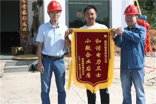 「我今年養了3000多隻羊,每天要消耗大量的青飼料。今天新上的劉家2臺區通了電,我養殖場的動力表也完成了增容,源源不斷的可靠電力一下子解決了我的青飼料加工用電問題,還為我節約了大量資金,我創業的信心更足了,電力公司真不愧是我們小微企業的堅強後盾!」9月26日安徽黃山歙縣劉家村養羊專業戶蔣曉虹展開一面書寫著「和諧電力衛士,小微企業後盾」的大紅錦旗激動地說道。