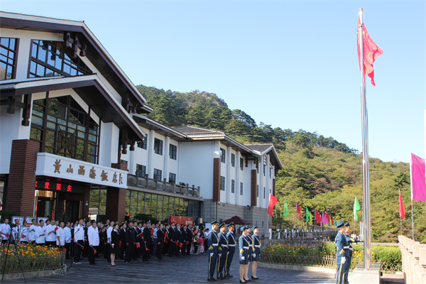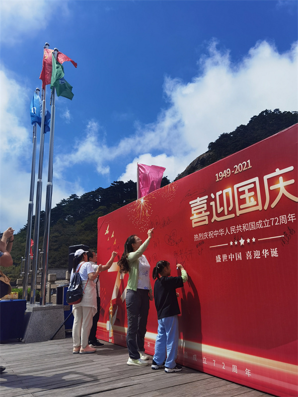 10月1日上午,在黃山之巔的玉屏樓廣場、西海廣場、排雲樓廣場、天海廣場等地,黃山風景區隆重舉行升國旗儀式,景區幹部員工和來自五湖四海的遊客參加升旗儀式,熱烈慶祝中華人民共和國成立72周年。