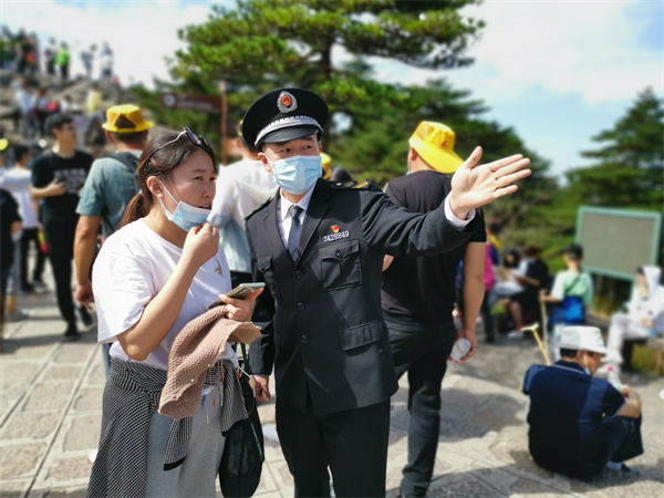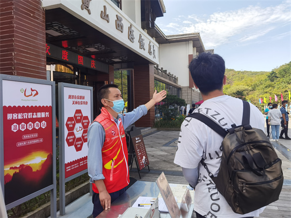 景區各行各業開展迎客松黨群志願服務,為遊客提供幫助。柳玉真 攝