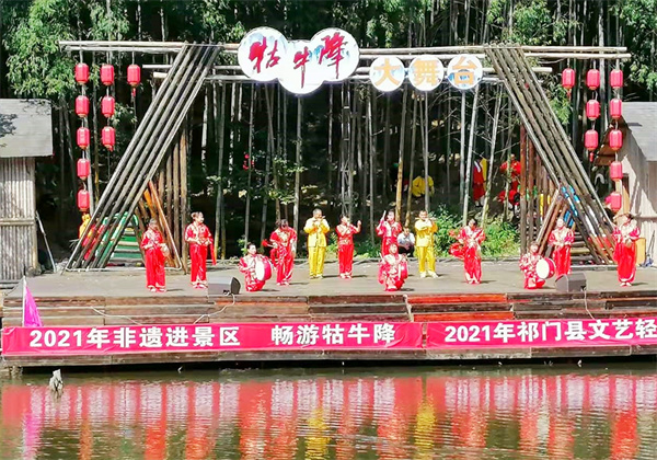 10月2日,安徽黃山市祁門縣牯牛降景區熱鬧非凡。當天上午,景區牯牛降大舞臺上,非遺進景區展演活動在火熱進行中。