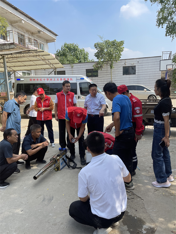 10月2日上午,河南省鄭州市紅十字水上義務救援隊隊長牛振西,帶着10餘名身着紅裝的「綠城使者」來到了葉縣馬莊鄉李莊村,他們再次為葉縣受災群眾捐贈生活急需物資,並熱心為村民們講述彌霧機等專業消殺設備的使用方法。