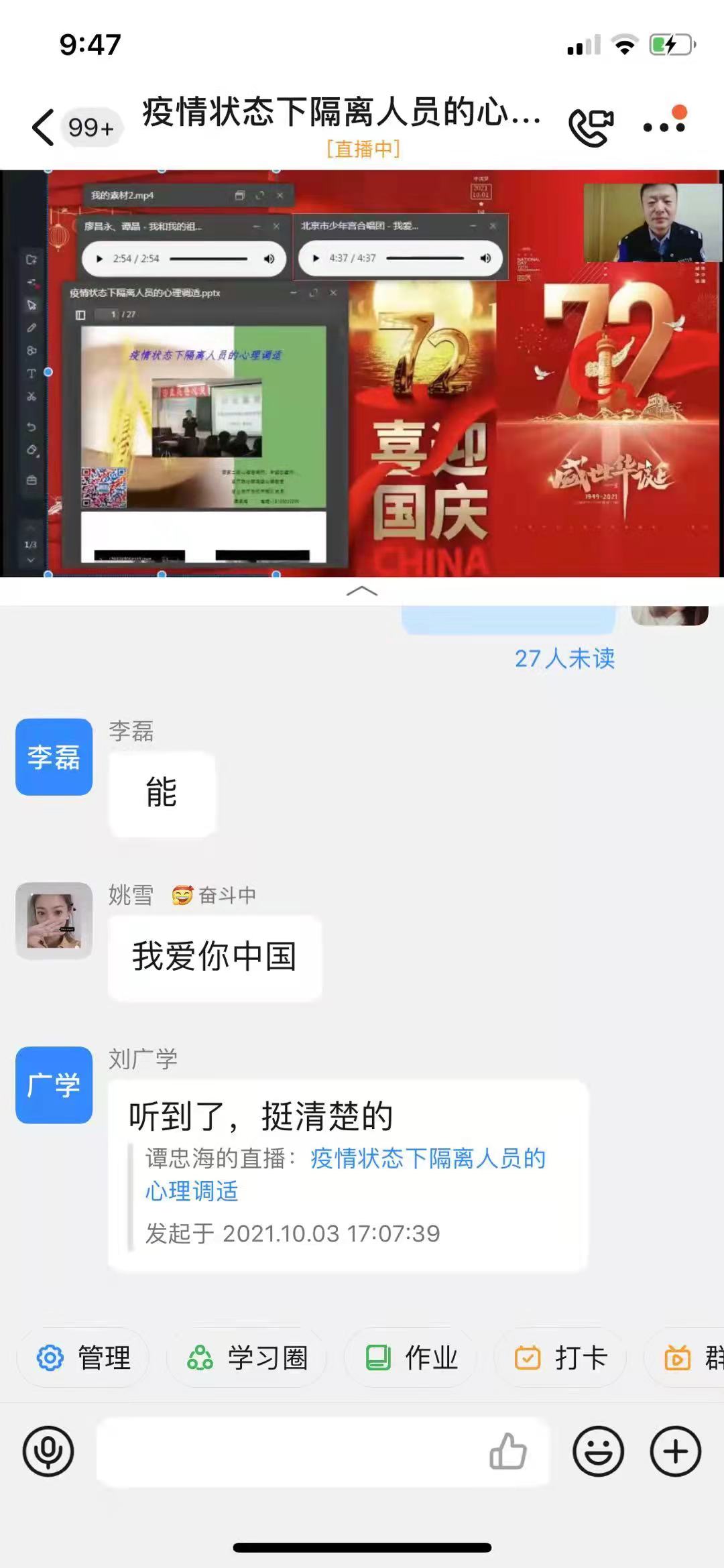 課題的主要內容為心理學上的接納、認知行為療法、積極心理學以及正念療法等。通過互動提問等形式,譚忠海對居家隔離人員開展心理疏導,幫助他們疏導情緒、增強信心,提高自我防護意識,加強自我監測。居民紛紛表示,通過參加輔導,不僅舒緩了隔離期間的煩躁情緒,更豐富了心理學知識,感謝老師特殊時期的耐心講解。有了情緒的舒緩和專業知識的支撐,相信一定能順利順心度過這些特別的日子。(記者 張曉磊 通訊員 高琳)