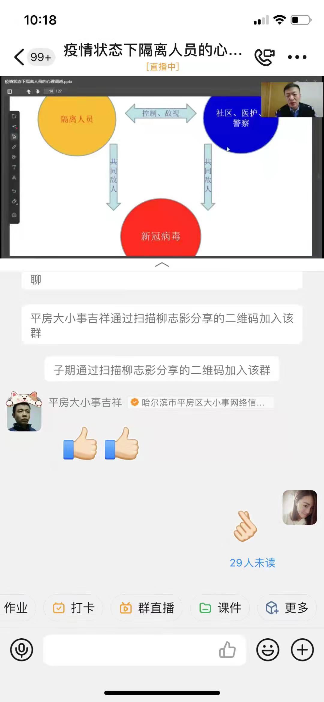為有效配合疫情防控工作,緩解居家隔離人員緊張情緒,日前,國家二級心理諮詢師、省公安廳高級心理教官、平房公安分局戶政科民警譚忠海為萬米社區和碧水灣社區居家隔離居民開展線上專題心理輔導,通過釘釘網絡線上授課平台進行直播輔導,題目為《疫情狀態下隔離人員的心理輔導》。