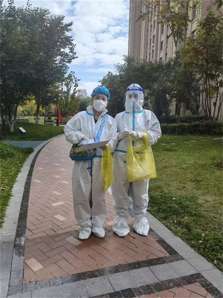 「您好,我們是來給您做核酸檢測的,請您開門配合。」趙學玲和社區的工作人員一次次敲開因居家隔離而緊閉的房門。從保利城一到五期、匯錦、保利上城,到保利天珺、萬科濱江大都會……隨處可見穿着厚厚防護服、爬樓梯採集核酸的趙學玲那略顯疲憊但又英姿颯爽的身影。