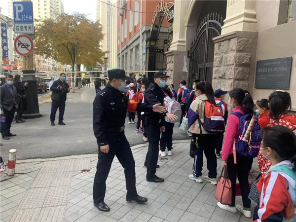 10月13日,南崗區88所中小學開學複課。南崗分局提前謀劃,科學部署,在做好疫情防控工作的同時,組織警力深入轄區中小學,全力開展護航復學複課工作。分局組織相關單位提前對校園內外開展「拉網式」排查整治,全面清理整治學校周邊營業場所,淨化校園周邊環境;同時,發揮「法制副校長」職能作用,由社區民警牽頭,重點檢查學校教室、食堂等區域部位,確保消殺、掃碼、測溫等工作落實到位,嚴防師生聚集風險;在學生上下學期間設置「護學崗」,聯合學校安保力量,協助學生做好出入登記,確保校外人員不得進入,切實做到校園門口「見警力、見警車、見警燈」,保障校園秩序。
