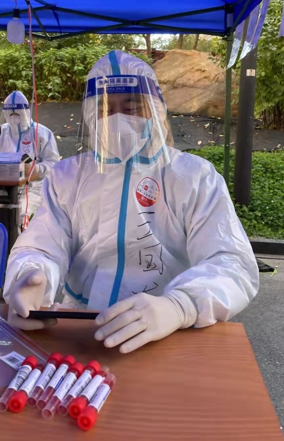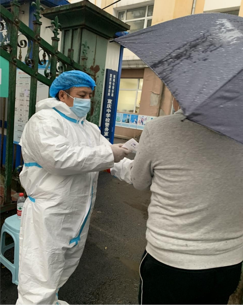 機關黨委王國龍,他一到社區就和社區書記表態:我是志願報名來社區服務的,只要我能做的,儘管安排,我就想扎紮實實地為群眾做點事。這是他第二次下沉社區參加疫情防控工作。記得第一次下沉社區,他在冰天雪地的卡口為居民掃碼測溫、出入登記、為隔離人員運送生活物質、傾倒垃圾……,還積極獻血、捐款,為戰疫情貢獻力量。這次,他下沉的香坊區上東社區都是高層建築,先後有9個單元被封閉管控,人口眾多,其中一棟樓就400多戶,任務相當繁重。他領受的任務不僅要參加全民核酸檢測數據採集,還要為被封閉管理的包括「二密」在內的群眾單獨上門核酸檢測、每日運送物質、核實流調信息等工作,經常與隔離人員「面對面」的近距離接觸。有人問他:你這樣多危險啊?他說:再危險的工作也得有人做啊,如果我不做,就得有別人做,別人不是一樣有危險嗎?對於曾從軍23年的他來說,早已把個人安危置之度外。