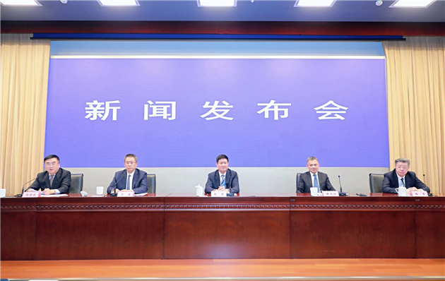 安徽自貿試驗區建設一周年新聞發佈會現場,左起:安徽省委宣傳部副部長、省政府新聞辦主任鄭明武主持發佈會,蕪湖市人民政府市長寧波,省商務廳廳長、省自貿辦主任張箭,蚌埠市人民政府市長操龍燦,合肥市委常委、市人民政府副市長路軍