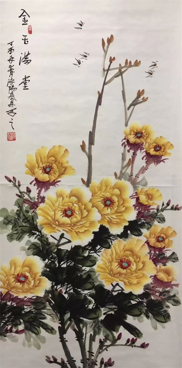 郭泰森是中國花鳥畫學會會員、一級美術師,河南省美協會員,洛陽市美協理事、洛陽平樂牡丹書畫院院長,被譽為「中國牡丹畫第一村」農民牡丹畫掌門人。他筆下的牡丹神韻兼備、生機盎然、艷而不俗,他創作的《富貴天香》《唯有牡丹真畫色》《富貴吉祥》《天香送吉祥》等數十幅畫作在國內外大賽中榮獲金獎和一等獎,部分作品被國內多家美術館、博物館收藏。更為難能可貴的是,以郭泰森老師為代表的一大批農民畫家,充分利用洛陽牡丹的社會影響力,把平樂村打造成中國牡丹畫產業發展中心,建成全國最大的生產銷售牡丹畫基地。如今平樂村的農民畫家已發展到1600多人,牡丹畫年銷量40多萬幅,綜合收益達1.2億元,成為全國實現文化產業經濟效益和社會效益雙豐收的經典範例。