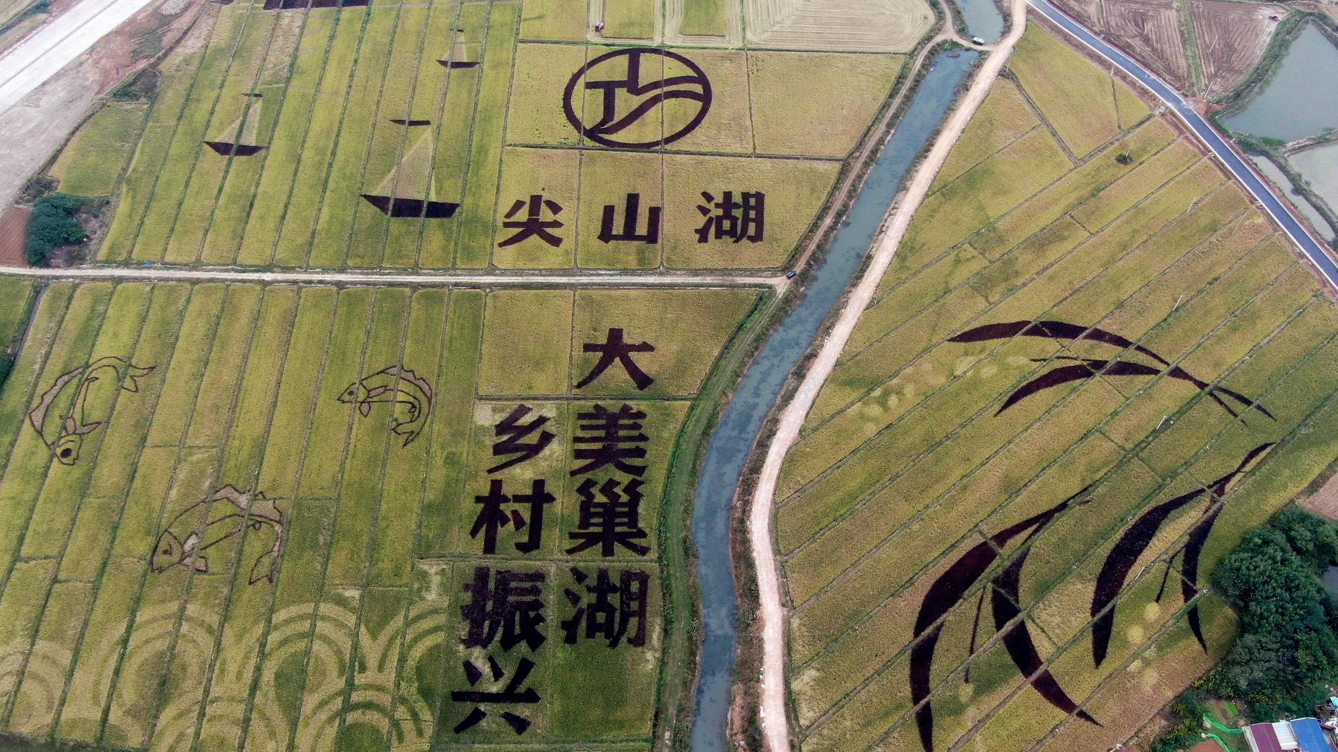 據了解,彩色稻是指水稻的葉子、谷穗或稻米呈現出不同於普通水稻的色澤,它不僅擁有秀麗外貌,而且富含人體所需的微量元素。這片巨幅稻田畫佔地600餘畝,稻田畫以「鄉村振興」和「大美巢湖」為主題,並輔以「帆船」「魚」和「稻穗」「尖山湖」等卡通形象元素,既為尖山湖逸趣園打造了一張靚麗的名片,也豐富了現代農業的觀賞性。
