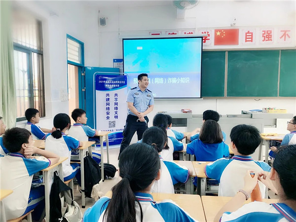 深汕公安分局反詐中心的民警蔡釗斌用生動的案例,讓學生在愉快的氛圍中了解「什麼是網絡詐騙」「如何預防網絡詐騙」,並通過互動式教學的方式適時地向學生們傳授防詐騙知識,博得了學生們的陣陣掌聲。