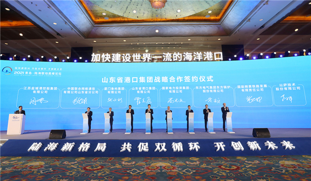 論壇上,山東港口黨委書記、董事長霍高原代表山東港口與國家電投集團公司、廈門象嶼集團有限公司等7家企業夥伴簽署戰略合作協議,山東港口黨委副書記、董事、總經理李奉利代表山東港口與濟南市、青島市等山東7市政府簽署共建大宗商品交易「1+N」布局戰略合作協議;山東港口物流集團、海外發展集團、北京魯港控股、日照港等分別與合作夥伴簽署5項協議。