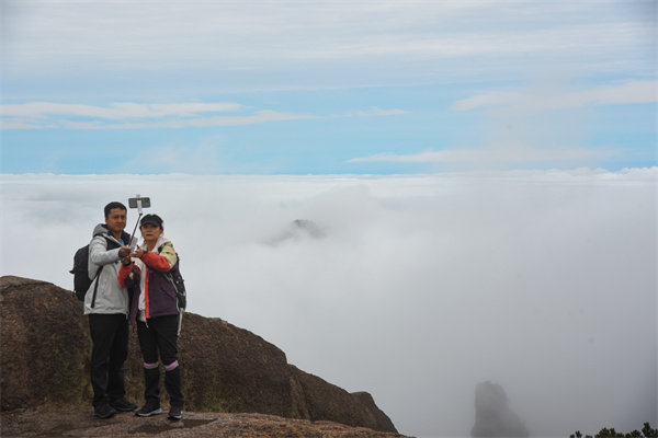 如果說秋天的黃山是時間饋贈的寶藏,那秋日的黃山雲海便是大自然給與遊客的另一份禮物。都說,黃山之景瞬息萬變,四時皆不同,或許前一刻還是薄霧籠罩,但隨著一陣秋風吹拂,那只無形的手便會揭開山間的這層薄薄面紗,巍峨的山峰、遠方的怪石都出現在遊人眼前,捉迷藏般時隱時現,引得遊客連連驚呼,太美了。“我們真的太幸運了”第一次遊黃山的深圳遊客王曉菊激動地告訴記者,上午還是有霧的,但是我們等待了一會,這下天晴了,雲海就被我們看到了,黃山太美了,遠離繁忙的城市生活,來黃山走一走,看看秋色、雲海,真是一個不錯的選擇。
