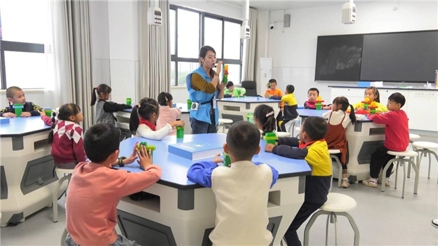 而在教學樓教室內,五年級二班的學生們正安靜地書寫著作業,學科老師不時為學生答疑解惑。