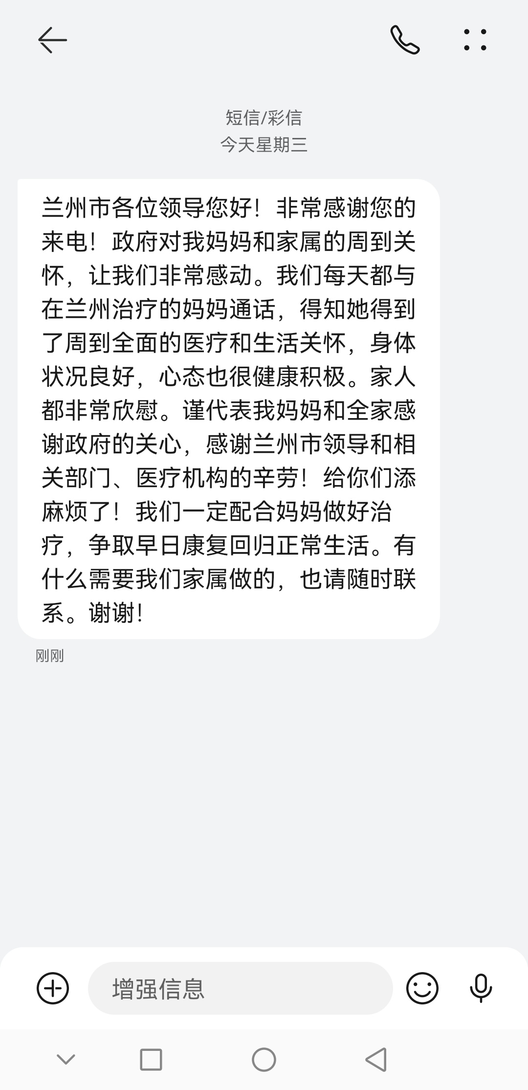「這次我媽媽來甘肅旅遊期間,不幸感染新冠,但是在隔離、診斷、治療期間,得到了當地政府無微不至的關愛。在醫院治療期間也得到了醫護人員的悉心照料,高水平的治療。作為患者及家屬,我們深表感激!我們也會配合相關部門做好疫情防控及病毒溯源工作。目前,我們家屬暫時沒有來蘭州的計劃,如果今後有來蘭計劃,我們會第一時間與您取得聯繫,再次對蘭州市政府及蘭州人民表示感謝!」這是多日奮戰後,甘肅省蘭州市文旅局負責人接到的新冠肺炎患者家屬發來的感謝短信。