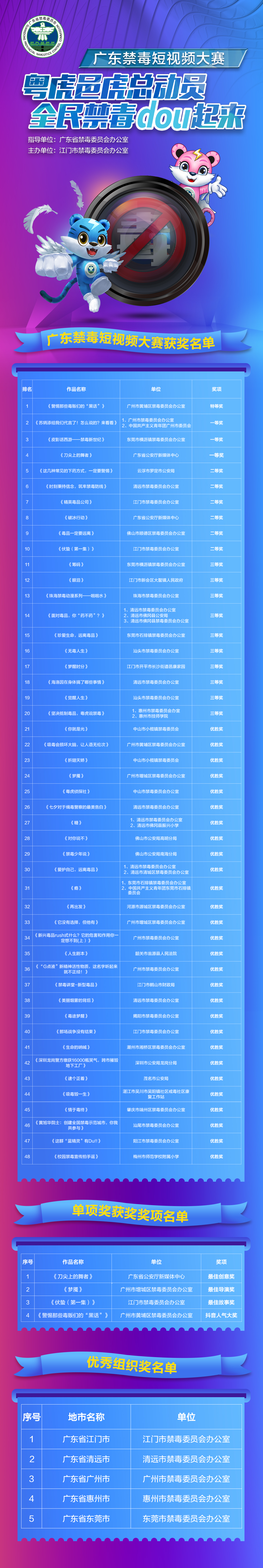 記者28日從廣東省禁毒辦獲悉,10月26日,由廣東省禁毒辦指導、江門市禁毒辦具體承辦的「粵虎邑虎總動員全民禁毒dou起來」廣東禁毒短視頻大賽頒獎禮在抖音線上舉行,共有52部作品及5個單位獲獎。
