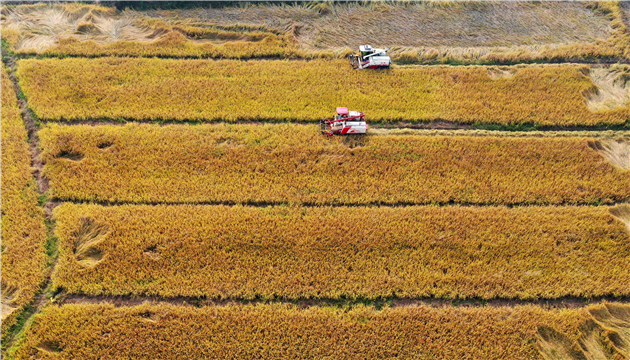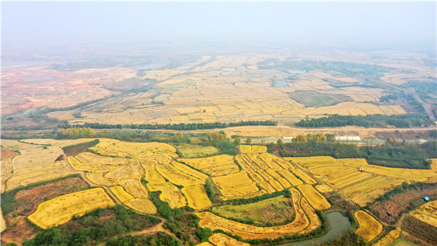 10月28日,安徽省合肥市蜀山區小廟鎮鄉村田野鋪金、稻穀飄香。一片片高低錯落、形狀不一的金色稻田,連同交相輝映的河流、水塘、綠樹、道路,就像打翻在大地上的調色板,鄉村田野風貌美不勝收,一派豐收的喜人景象。