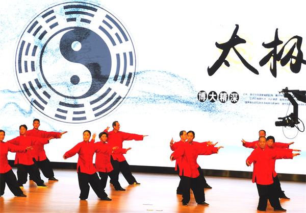 此次交流活動不僅有現場的太極推手、太極劍、太極舞蹈表演,120名太極愛好者共同表演的快閃,太極名家的現場訪談交流,太極文化論壇,還有太極文化產品和非遺傳統剪紙、麵塑、香囊、刺繡等手工製作技藝展示等。